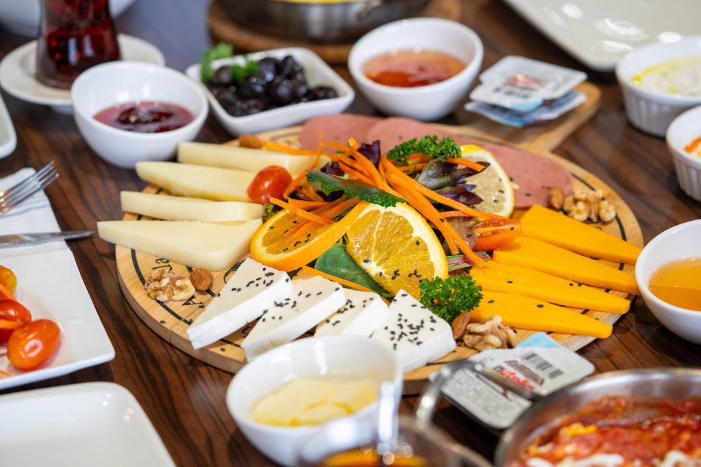 This is joined by fried eggs, a rich cheese platter, savoury mushrooms with mozzarella, spicy Sujuk, and a vibrant mix of vegetables. This feast also includes a variety of appetizer dips like Haydari and roasted pepper with yogurt, French fries, and a pastry tray filled with the crispiest Turkish bagels, buns, and Borek.