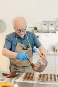Gunn's Hill aging room photo with Shep walking down a row of cheese