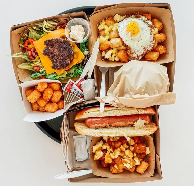 The transition to a nostalgia-inspired venue wasn’t a huge leap for The Vic, which already had painted window signs saying things like, “Good food, good mood” and a frequently Instagrammed rainbow mural. Sticking “old school,” Szabo’s team simply placed giant menus in front of their existing spaces, with the instructions for patrons to flick their hazards when they were ready to order. The menu is a “healthy-minded” take on drive-in classics—burgers, shakes, hotdogs—with options for vegans and vegetarians. The biggest draw is the breakfast poutine, which swaps out gravy for hollandaise and fries for their signature tater tots, all doused liberally in an addictive spice mix they call “magic dust.” (Breakfast is, unsurprisingly, their busiest time.)