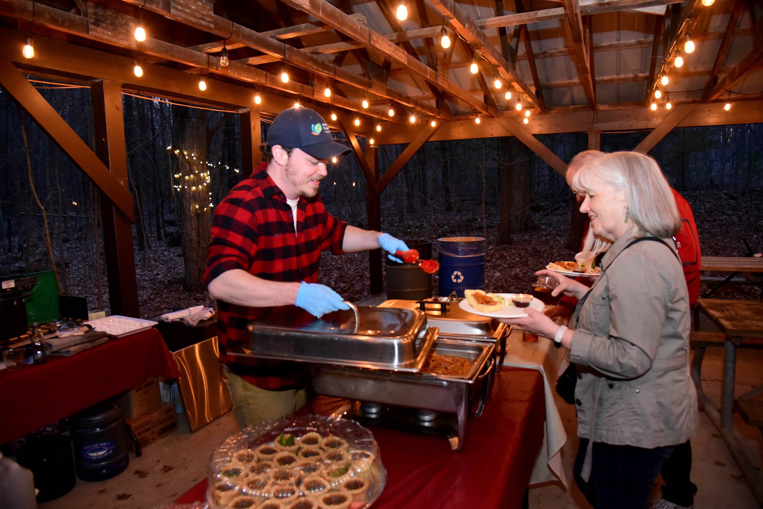 The ambiance of “Lamplight” is further enriched by the presence of live music, provided by Rag Maple Music, whose melodies resonate through the forest, creating a backdrop of acoustic pleasure. Guests are invited to relax by a campfire, the flickering flames casting a soft glow on the surroundings, enhancing the magic of the evening. This setting offers a perfect blend of comfort and entertainment, allowing guests to unwind in the beauty of nature while enjoying the company of fellow maple syrup enthusiasts.