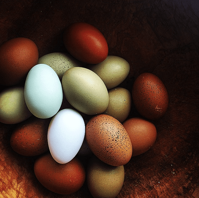 No time to colour eggs? Heritage breed hens lay eggs in the most beautiful shades of brown, green and blue. Just look at these beauties from the ladies at Mad Maple Country Inn!