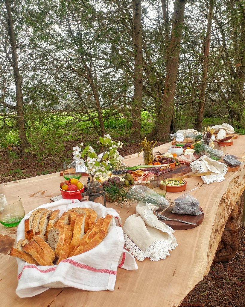 As you climb the small hill to the patch of cedar trees near their house, the most beautiful sight unfolds before you. There, atop a massive raw edge table Dave built himself, is a feast. It’s covered in so many delicious treats, you can almost hear the table grown.