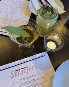 overhead shot of sticky bun, breakfast ray, breakfast sandwich and two coffees at Sweet North Bakery
