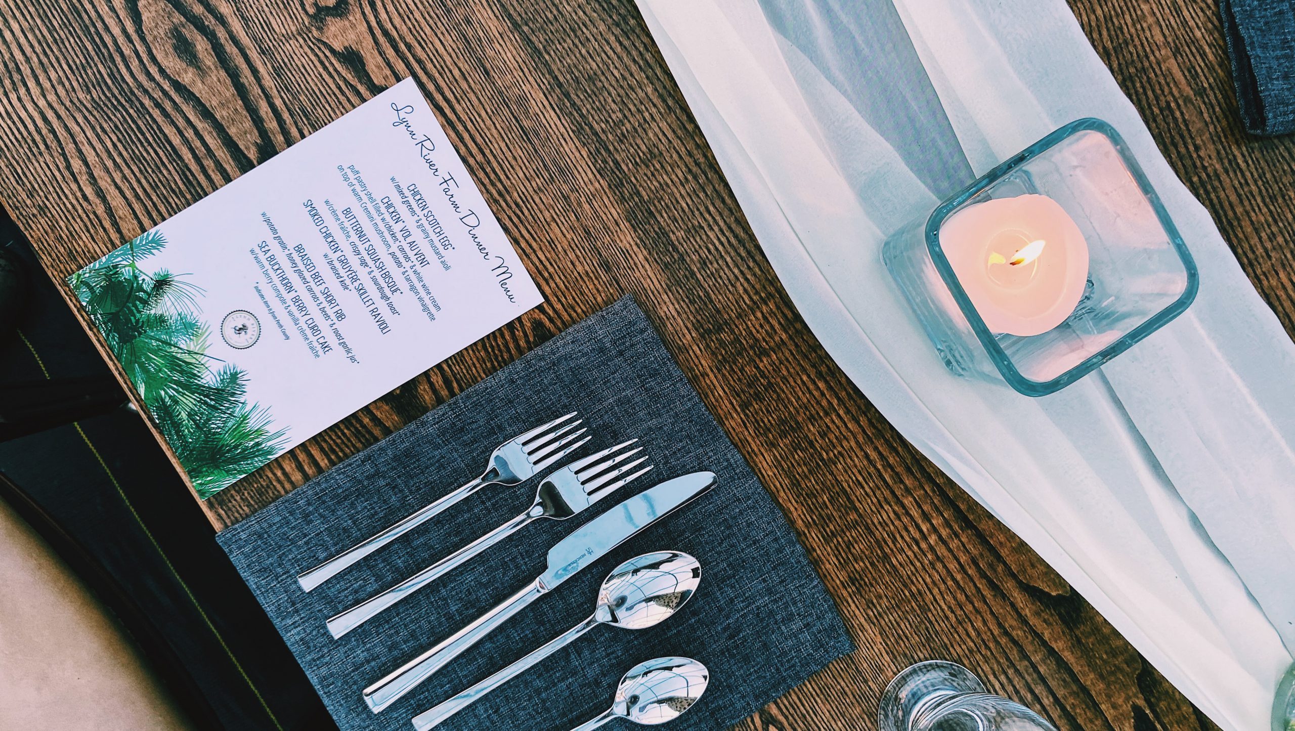 Walking up to the greenhouse along the snowy tiki torch lined path, we knew we were in for a special night. Cooper, the farm dog, greeted us with a grumpy bark – but he’s a gentle giant. We were welcomed with beautiful candlelit table settings and cozy string lights to create the perfect atmosphere for a home-cooked, farm-to-table feast inside the greenhouse.
